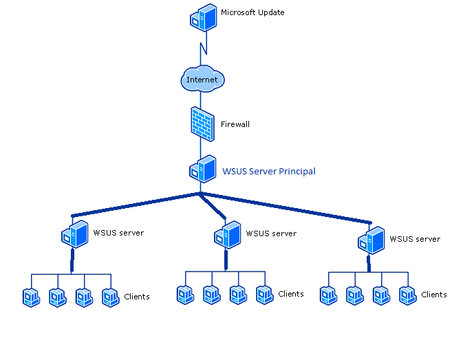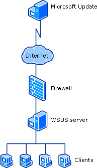 Es la configuración más sencilla. Un único servidor WSUS se conecta directamente a Microsoft Update a través de Internet para descargar las actualizaciones.
