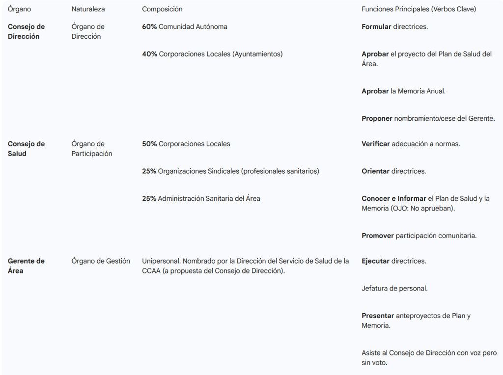 El Área de Salud es la pieza angular del sistema. El Artículo 56 la define como la «estructura fundamental del sistema sanitario». Es la unidad geográfica y funcional responsable de la gestión unitaria de los centros y prestaciones.