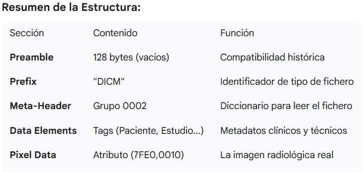 La estructura física de un fichero DICOM (especificada en la Parte 10 del estándar) es fundamental para diagnosticar corrupciones de datos o problemas de transferencia en la cabina de discos.