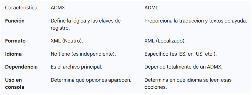 La principal diferencia entre estos dos tipos de archivos radica en la separación de funciones: mientras que el archivo ADMX contiene la estructura técnica y lógica de la directiva, el archivo ADML contiene el texto y las descripciones en un idioma específico.