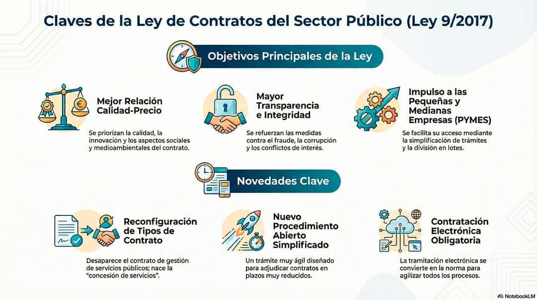 La Ley 9/2017, de 8 de noviembre, de Contratos del Sector Público (LCSP) es la norma fundamental. Su importancia radica en que no solo regula cómo se compra, sino que se utiliza como herramienta para implementar políticas públicas (sociales, ambientales y de innovación).