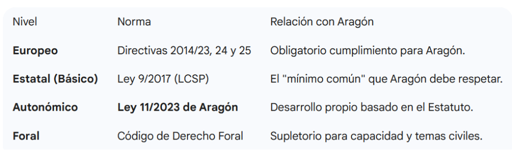 - Ley 3/2011, de 24 de febrero, de Medidas en Materia de Contratos del Sector Público de Aragón: Es la ley propia que adapta la gestión a la realidad aragonesa.