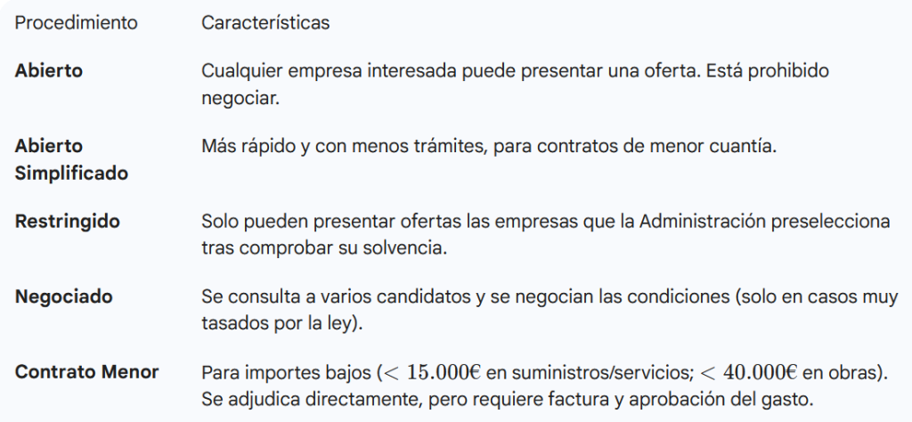 Aquí es donde la Administración sale al mercado. Dependiendo de la cuantía y la complejidad, existen distintos procedimientos: