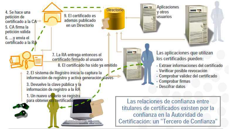 - Autoridad de Registro (RA): Actúa como interfaz entre el usuario y la CA, verificando la identidad del solicitante.