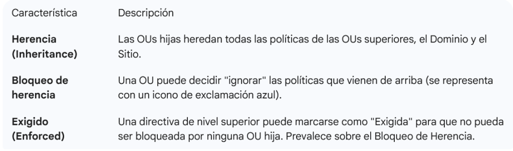 - Vínculos (Links): Para que una directiva surta efecto, debe «vincularse» a un nivel específico de la jerarquía (Sitio, Dominio o Unidad Organizativa).