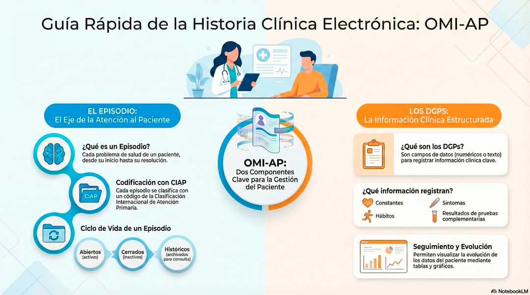 El sistema OMI-AP se erige como una solución integral para la gestión de la Historia Clínica Electrónica en la Atención Primaria de Aragón. Su arquitectura cliente-servidor, potenciada por la tecnología CITRIX, proporciona una base robusta para su despliegue en una red sanitaria extensa. Sobre esta infraestructura opera un ecosistema de módulos de software interconectados que cubren desde la actividad clínica diaria hasta la gestión de la seguridad y la explotación estadística. Finalmente, su modelo de datos, articulado sobre los pilares de la codificación CIAP, la organización por Episodios y el registro estructurado en DGPs, conforma una estructura diseñada específicamente para dar soporte a la continuidad y longitudinalidad asistencial, principios fundamentales de la Atención Primaria.